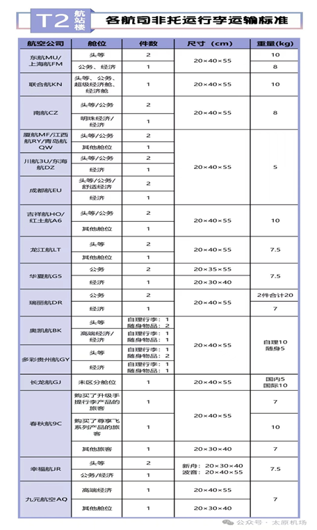 太原機(jī)場執(zhí)飛航空公司的隨身手提行李標(biāo)準(zhǔn)