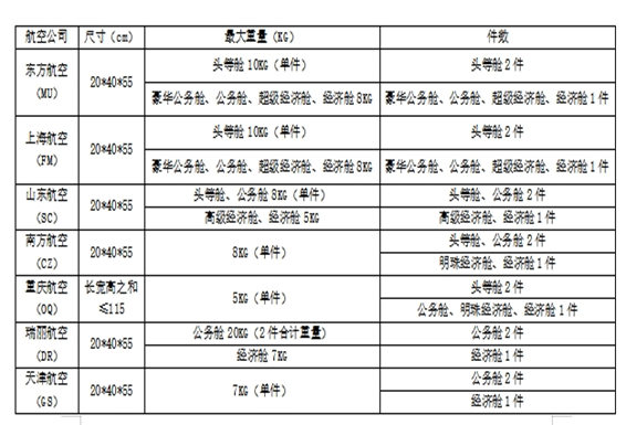 呂梁機(jī)場執(zhí)飛航空公司的隨身手提行李標(biāo)準(zhǔn)